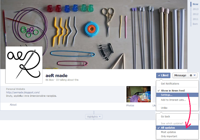 4. Z menu, które rozwinie się pod przyciskiem wybieramy interesujące nas opcje. Gorąco polecam kliknięcie “Show in News Feed”, a następnie “Settings” i “All updates”, by wszystkie posty aeR made na pewno znalazły się na waszych wall’ach.